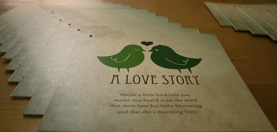两只小鸟的爱情故事主题的婚礼请柬。用婚礼请柬讲述你们的爱情故事。让嫩绿色的小鸟飞去,给宾客们送上你们的幸福邀请。